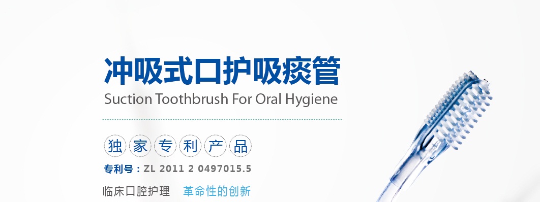 专利产品 用于口腔护理及口腔内的痰液吸引 可冲、可吸、可控、单人操作,临床上口腔护理革命性的创新 安全、有效,降低患者口腔及肺部的感染率 牙刷头采用硅胶材料,舒适方便,提高患者满意度 手柄手握舒适,硬度好,透明易观察 操作简单,减少护士工作量,降低护理成本